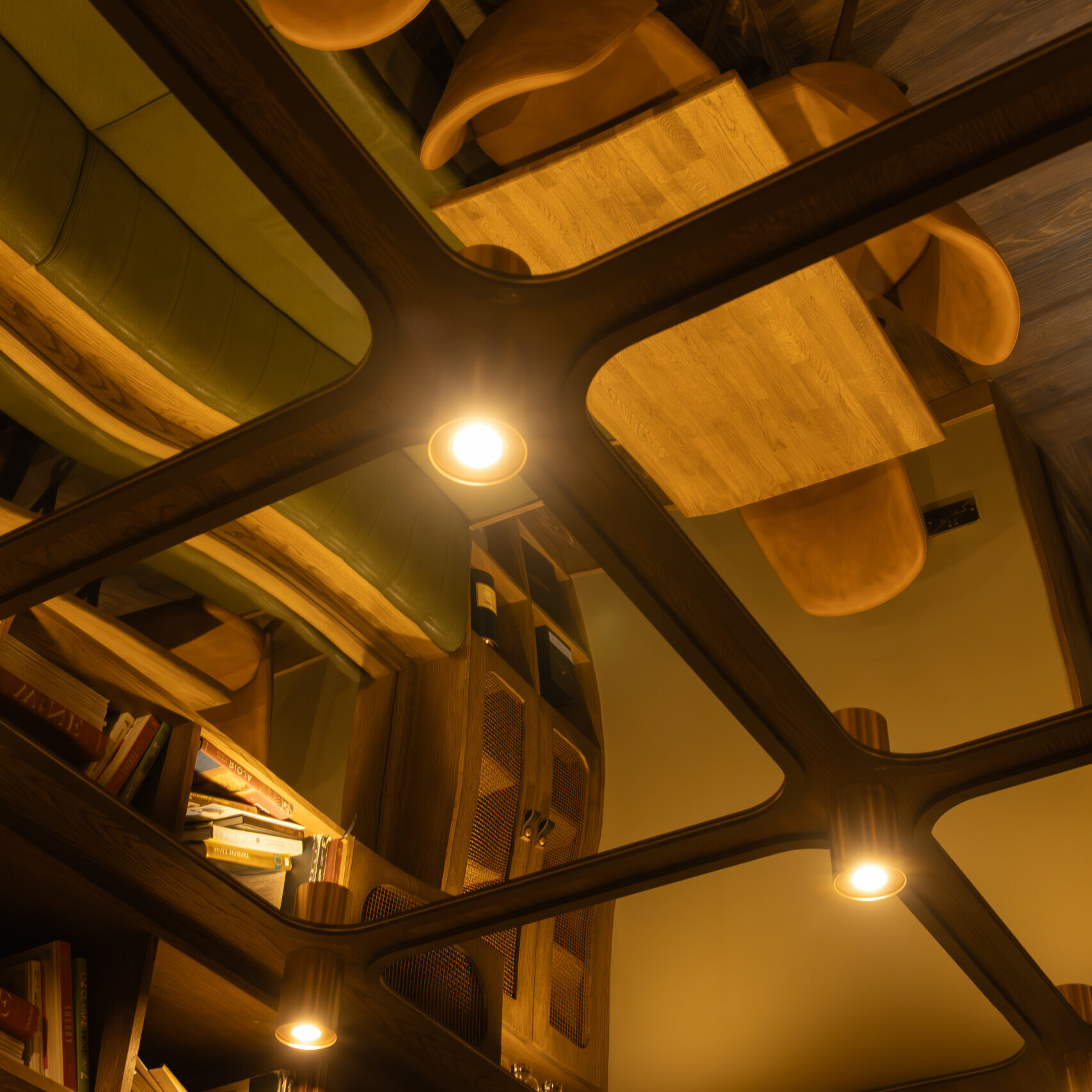 The walls are lined with handcrafted solid oak and oak veneer display units, manufactured in our in-house workshop before being expertly installed on site. For the ceiling, where height was limited, we designed mirrored panels to create the illusion of space and carry light throughout the room.